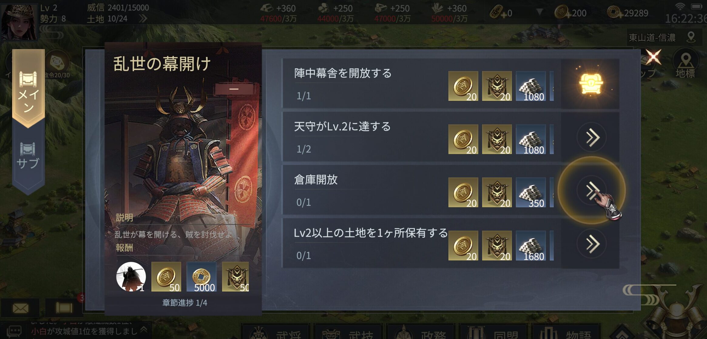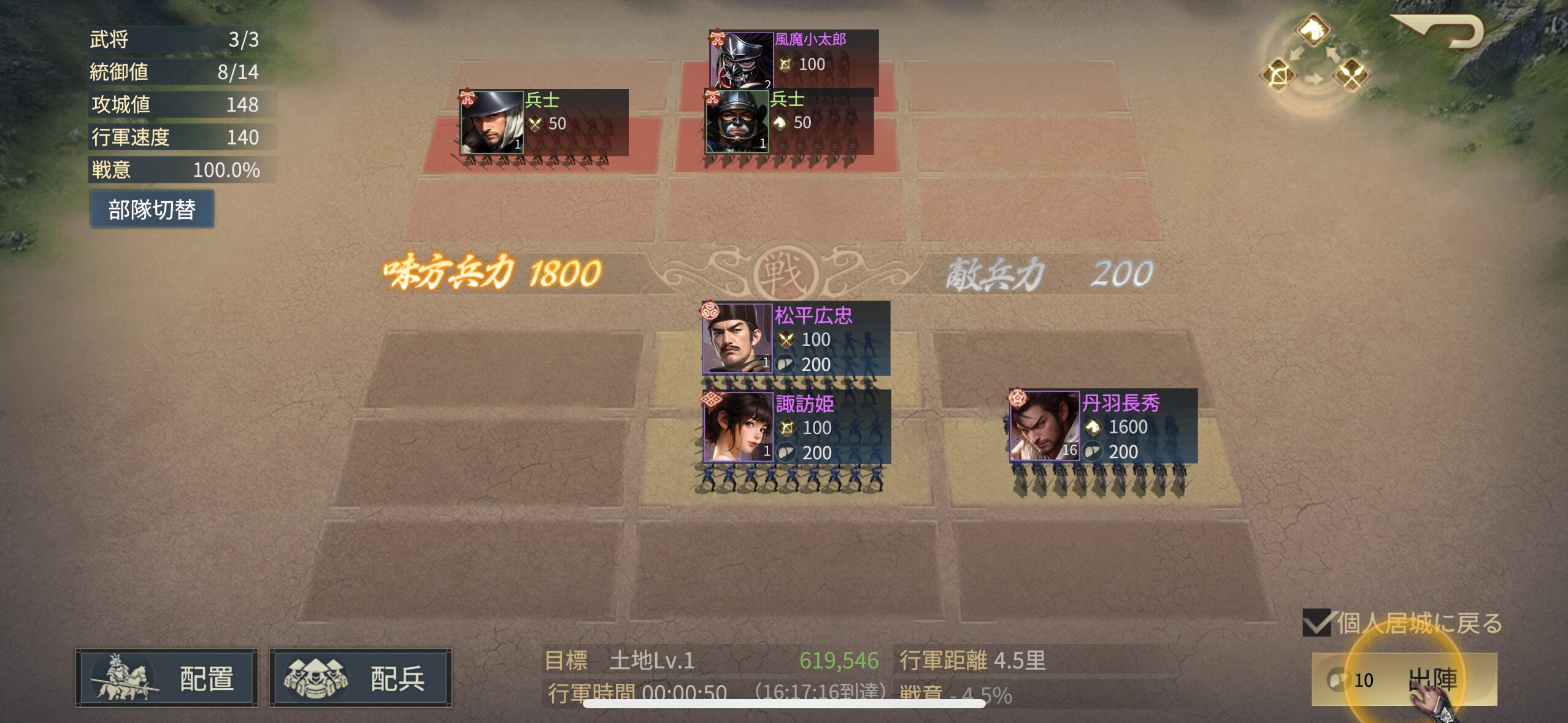 基本的なゲームの流れを学びながら、武将をたくさん仲間に加えて、討伐戦でどんどん土地を奪っていくのが最初の目標です。