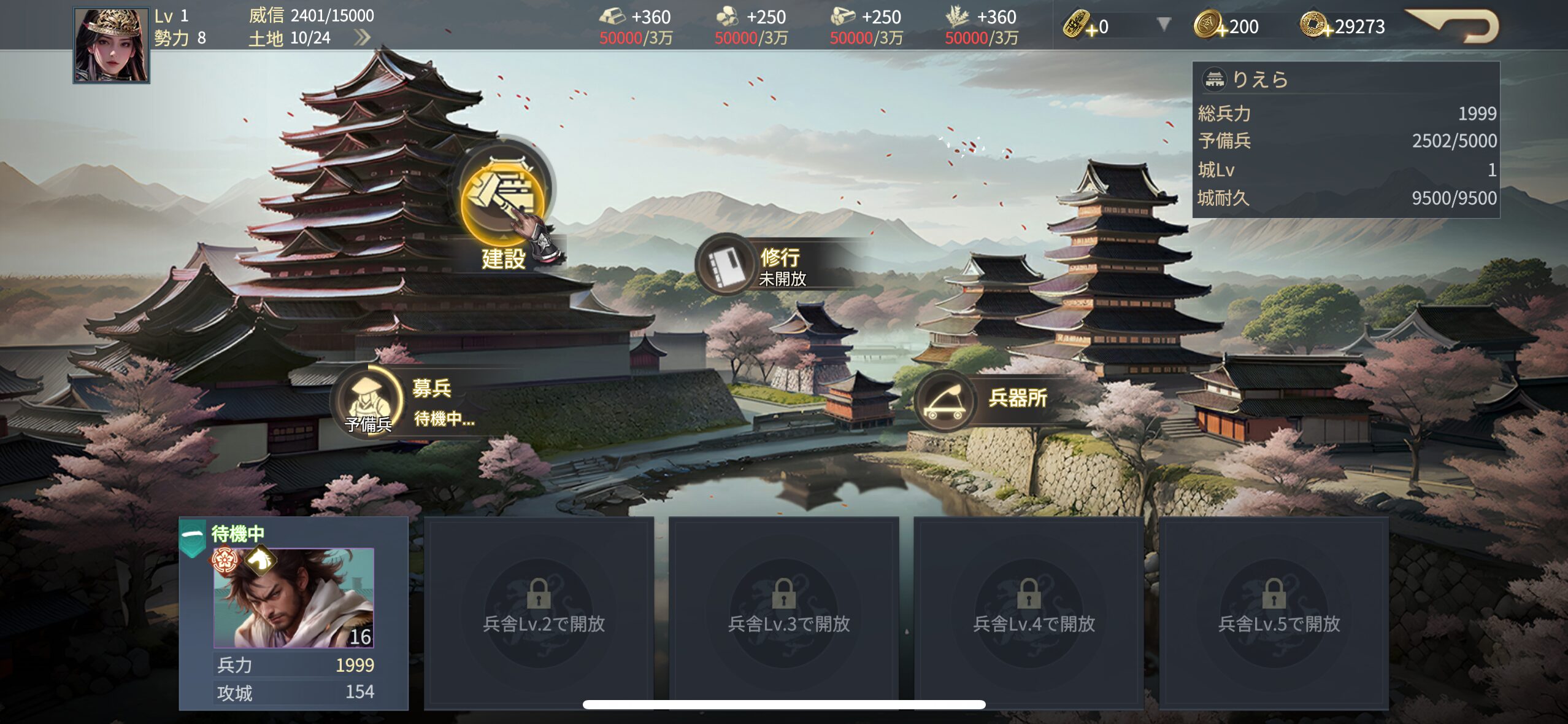 武将の強化は確実に行うとして、天守閣や倉庫、兵舎といった施設も強くしておく必要がありますよ。例えば、兵舎などを強化しておけば、部隊にセットできる武将の総合戦力を上げることにも繋がります!